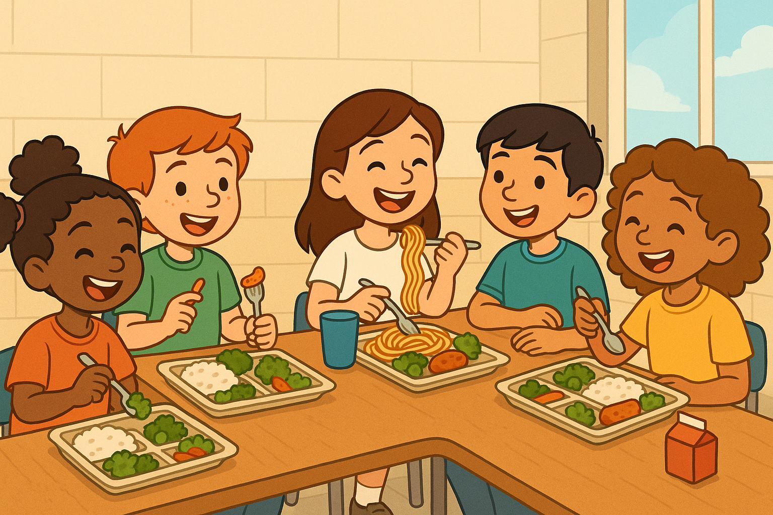 B: Yes, and they think the school lunches are way better, too.